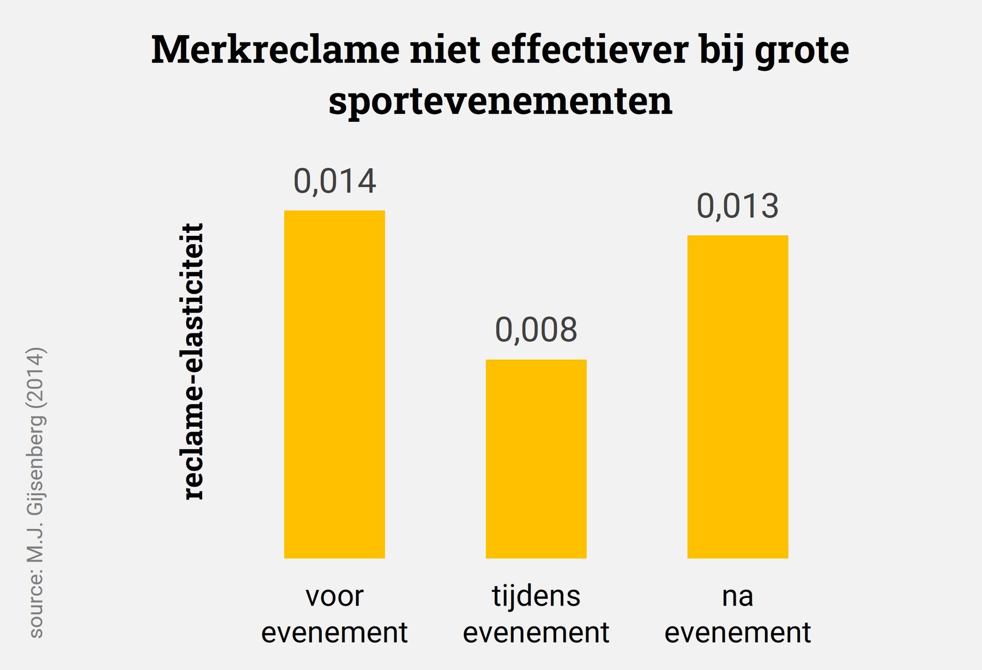 Onderzoek naar reclame-effectiviteit bij sportevenementen levert namelijk helemaal geen duidelijk beeld. Er zijn inderdaad onderzoeken die toenemende effectiviteit aantonen. Media- en reclamebereik zijn bijvoorbeeld hoger en positieve gevoelens bij een evenement of een geslaagde inhaker kunnen overgaan op adverterende merken. Maar er is ook onderzoek dat minder positief is. Zo is opvallen en gezien worden veel moeilijker door hogere reclamedruk en doordat merken vergelijkbare boodschappen en beelden gebruiken. Probeer met jouw oranjecommercial maar eens op te vallen tussen de andere vijftig tinten oranje.